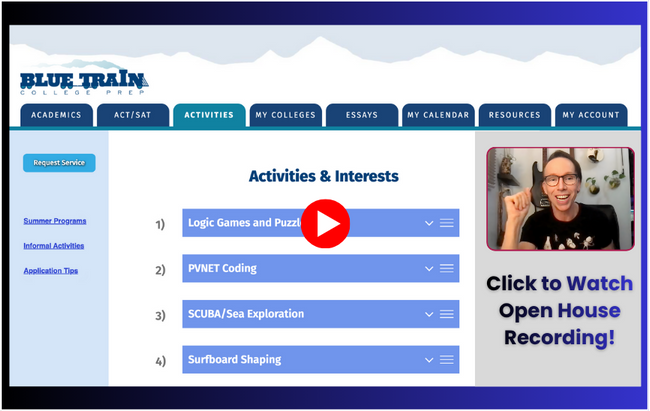 At Blue Train, our counselors take families on thoughtful tours of the different pathways, examining expected workload, potential burnout, and what picture your choices might (or might not yet) be painting. It's never too early or too late to set yourself up for success with thoughtful, experience-based academic planning!
